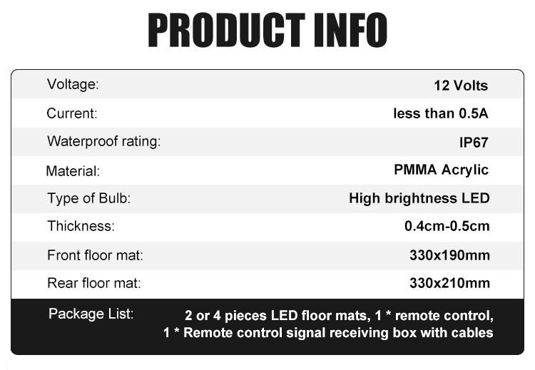 If you want to customize an illuminated floor mat kit, please click here: Customized LED Floor Mat.